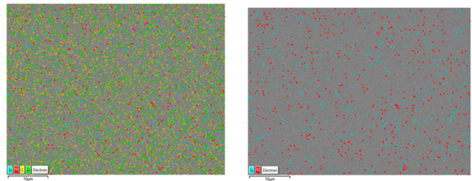 此圖顯示為本子計畫開發之有機/無機複合黏合劑配方經spin-on後塗層的EDS元素分析結果。其中碳(C)與氧(O)訊號乃對應到高分子黏著劑的基質(matrix);矽(Si)訊號則源自接枝型偶聯劑中的矽醇官能基(–Si(OR)₃);而鈦(Ti)訊號則來自TiO₂奈米粒子。由元素mapping的情況可知,鈦元素(紅色)呈現均勻分散之狀態,顯示TiO₂奈米粒子均勻分散在高分子黏著劑的基質(matrix)中。