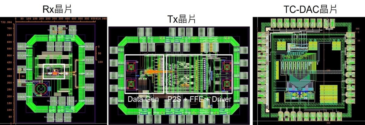 今年上半年我們成功下線三顆晶片,分別是接收機(Rx), 發射機(Tx), 與MRM溫控(Thermal Control DAC)晶片。這三顆晶片涵蓋矽光子通訊所需的光電轉換IC,是本中心的台科大團隊第一次完成以16nm CMOS製程實現光電轉換晶片,朝高速CPO的目標向前邁進了一大步。Rx 與 Tx 晶片分別在今年3月與7月下線,以112Gbps為目標。即便以16nm來說,對速度的要求略顯不足,我們還是可以藉由系統架構與電路設計來改善,設法趨近我們要達成的目標規格。TC-DAC是一個在90nm CMOS實現的10b 1GS/s DAC晶片,可以廣泛用在CPO所需要的雷射與溫控部分。這一年來,6位碩士生從無到有,加上TSRI的協助,一步步建立高速電路的設計流程,從技術紮根與人才培育來說,都是非常重要的收穫。