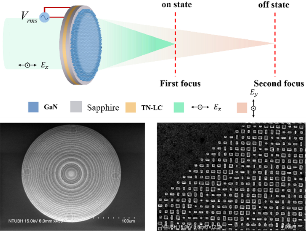 可調焦透鏡在光學系統中不可或缺。本團隊提出了一種與扭曲向列型液晶結合的電調變變焦超透鏡。在我們的設計中,超透鏡根據入射光的偏振狀態聚焦於不同的點。我們證明了這種變焦超透鏡具有亞毫秒的響應時間。此外,第一和第二焦點的數值孔徑可以自行調整,達到0.2至0.7的範圍。此外,在多個焦點處,全寬半高接近衍射極限。由於我們提出的電調變超透鏡的優勢,它在需要高圖像質量和快速響應時間的光學技術和生物醫學科學中具有應用潛力。