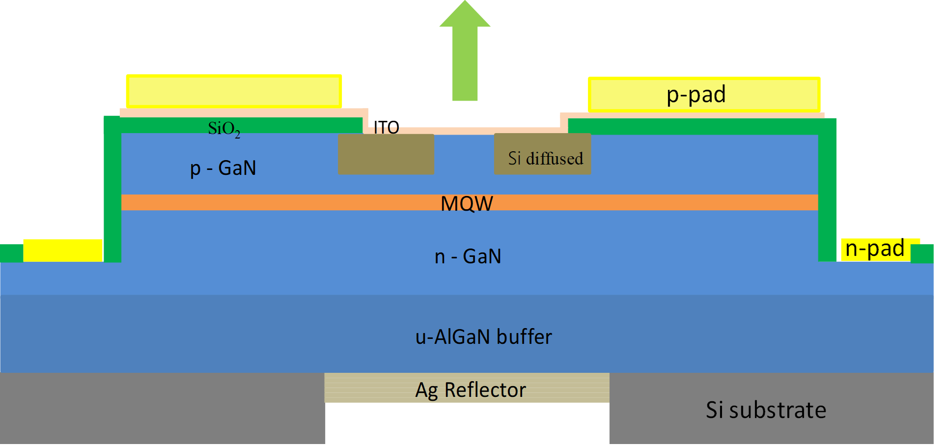 本研究使用了GaN-on-Si 晶圓(在矽基板上生長的 GaN 磊晶晶圓),製造並特性量測了綠光共振腔發光二極體 (resonant-cavity light-emitting diodes; RCLED),此研究成果將在CLEO-PR 2024[參考資料]與IEEE Xplore發表。與LED相比,RCLED具有光譜寬度窄、方向性佳、輸出耦合效率高、在各種注入電流或溫度擾動下峰值波長穩定等優點。與邊射型超發光二極體(superluminescent diodes)相比,RCLED 是表面貼裝元件,易於散熱且可分散放置。綠光RCLED 有多種潛在應用,例如鈦藍寶石晶體的光泵浦、畫廊中的定向照明和光動力療法。在這項工作中,我們成功地使用矽基氮化鎵晶圓製造了綠光RCLED,其中共振腔是在晶圓表面和銀反射鏡之間,如下圖所示。觀察到光縱模間距約為 16 nm 的幾個共振腔光模,而峰值波長約為500 nm。