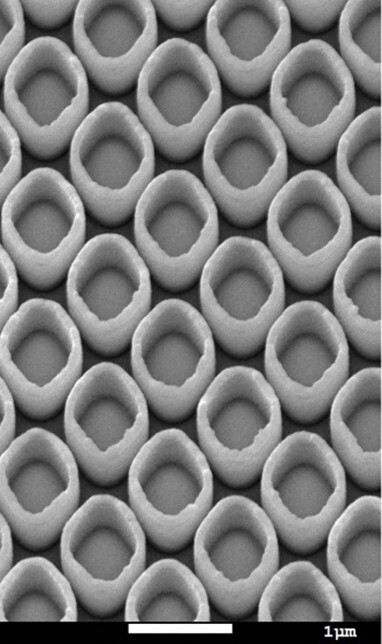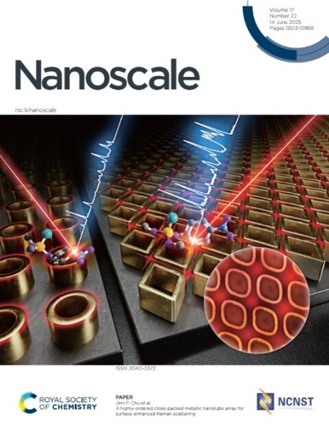加強表面增強拉曼散射訊號的「菱形金屬奈米管陣列」(左)技術已刊登於英國皇家化學學會期刊《Nanoscale》,並獲選為當期封面文章(右)。