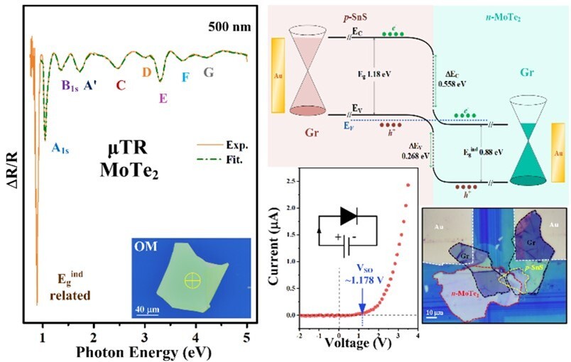 圖片說明:2H-MoTe2 的 μTR 光譜以及 p-SnS/n-MoTe2 元件的特性分析