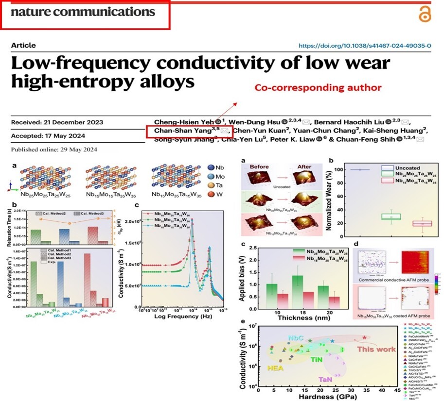 利用教育部特色中心的資源,成員楊承山教授開發的非破壞且非接觸式矽光子太赫茲探測技術,用於偵測高熵合金奈米薄膜之重要高頻光電特性,成功解釋其重要的物理特性,對半導體相關製程所用之金屬未來性,幫助甚大,並成功發表於Nature Communications。此外,過程中培育了3位碩士班與1位博士班畢業生,對於人才培育不遺餘力,朝著奠定台灣未來在全球半導體領頭羊之目標持續向前。