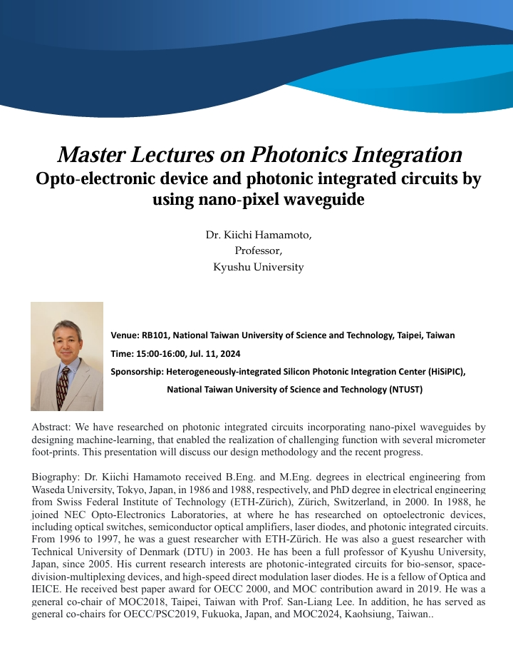 7月11日於臺科大綜合研究大樓一樓102會議室舉辦Master Lectures on Photonics Integration大師講座,邀請日本九州大學Prof. Kiichi Hamamoto來台與本中心師生進行演講及學術交流,講題為「Opto-electronic device and photonic integrated circuits by using nano-pixel waveguide 」,與會人數55人。