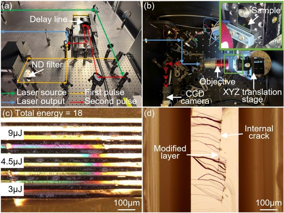 於捷克ELI Beamlines Facility執行合作之研究成果: (a-b)碳化矽飛秒雷射內部改質之實驗設置與 (c)內部改質特徵及(d) 4°傾角裂紋