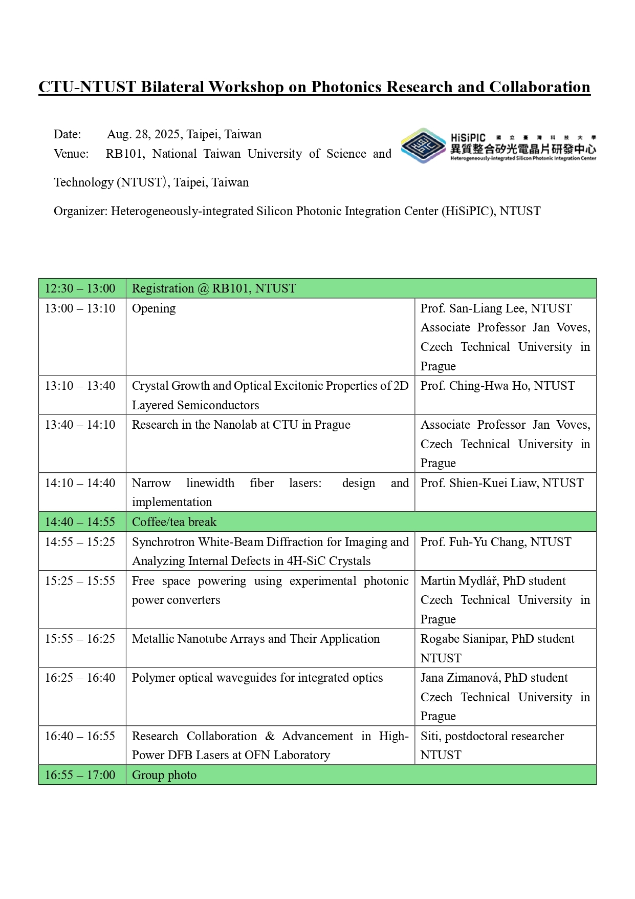 【活動通知】CTU-NTUST Bilateral Workshop on Photonics Research and Collaboration 捷克理工大學-台灣科技大學光電研究與合作雙邊研討會 08/28
